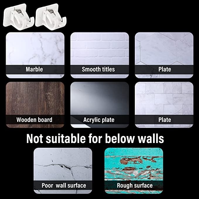 - Answer: These curtain hooks are suitable for many clean and smooth surfaces such as glass, tile, marble, etc. They are great for hanging net curtains, voiles, party decorations or DIY crafts; but are not suitable for older painted walls.